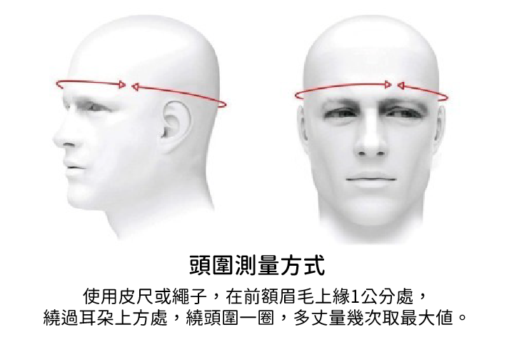 用皮尺或是布尺從眉毛上方水平往後腦最突出的位置測量,可量測2-3次抓取平均值會比較正確喔^^